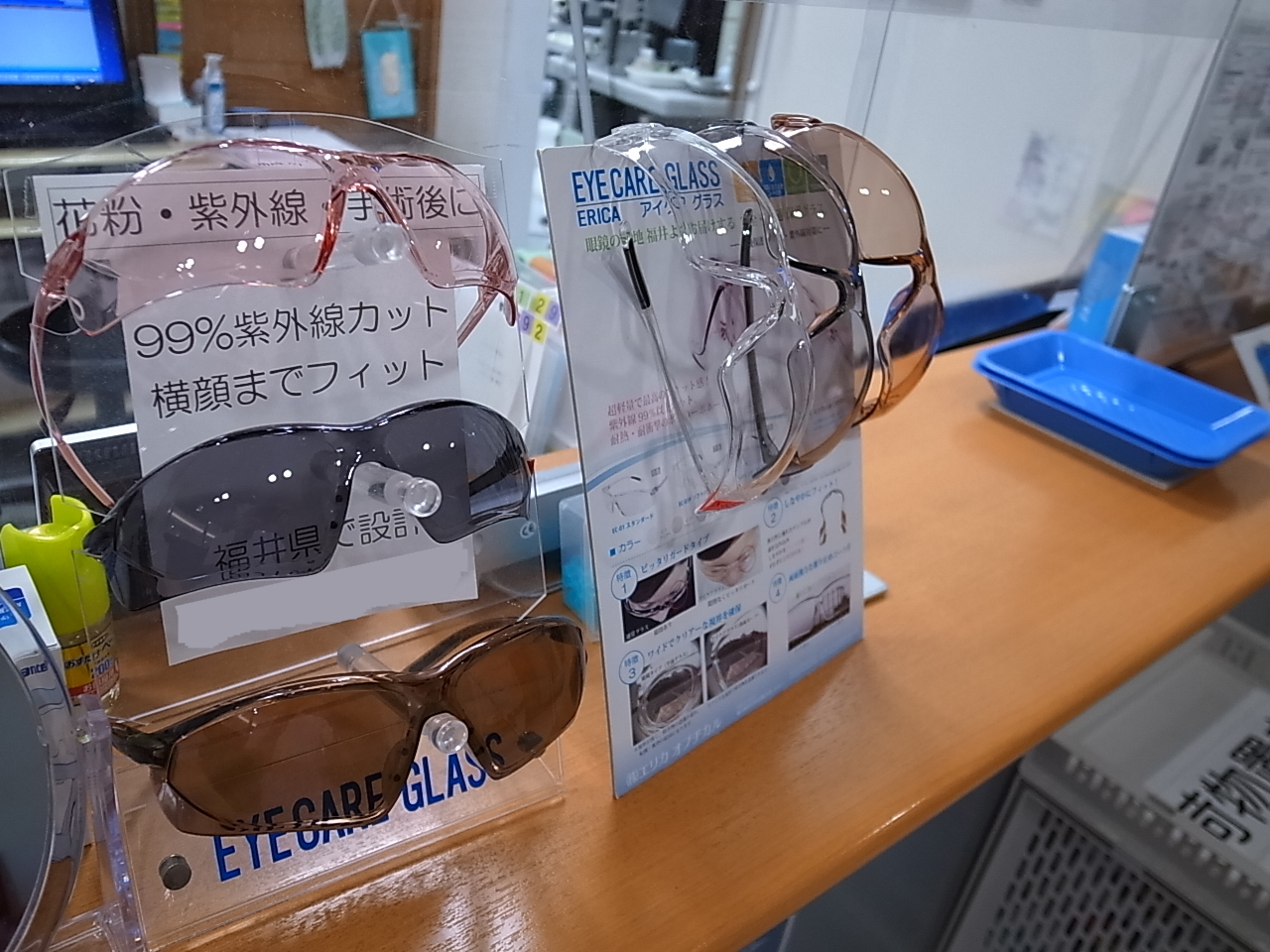紫外線、異物、花粉、手術後の対策に、 保護メガネのサンプルを展示しています。 99%紫外線カットし、横顔にもフィットする、 メガネの産地 福井県のメーカー製です。 ブラウン、グレー、薄いブラウン、薄いグレー、 ピンクなど色も選ぶことが出来ます。 更に丈夫なタイプのものもあります。 |